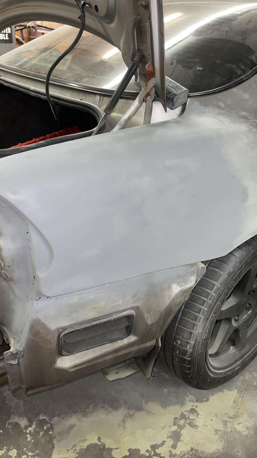 A compilation of images capturing various scenes from an automotive workshop, including car restoration, repair, and maintenance activities.